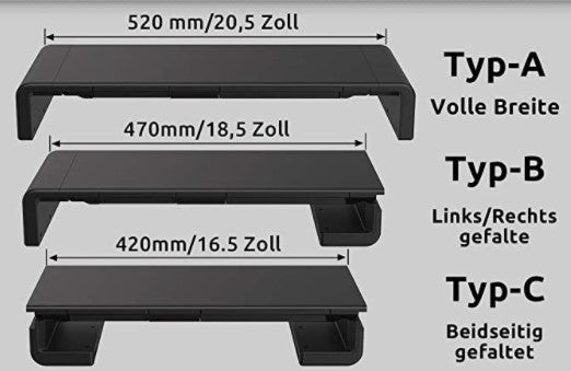 3-breedte en opvouwbare monitorstandaard: deze monitorstandaard is instelbaar met 3 soorten breedtes, 16,5 inch, 18,5 inch en 20,5 inch. Je kunt de breedte aanpassen zoals je wilt, de monitorstandaard is geschikt voor verschillende monitoren, je kunt ook de monitorhoogte verhogen.